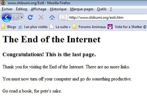 J’ai rencontré quelque chose d’étrange en configurant mon nouveau compte Google Reader: la fin d’internet. Est-ce que cela pouvait être vrai ? Je me suis dit que je n’étais pas vraiment arrivée au bout, car il me restait encore un lien.